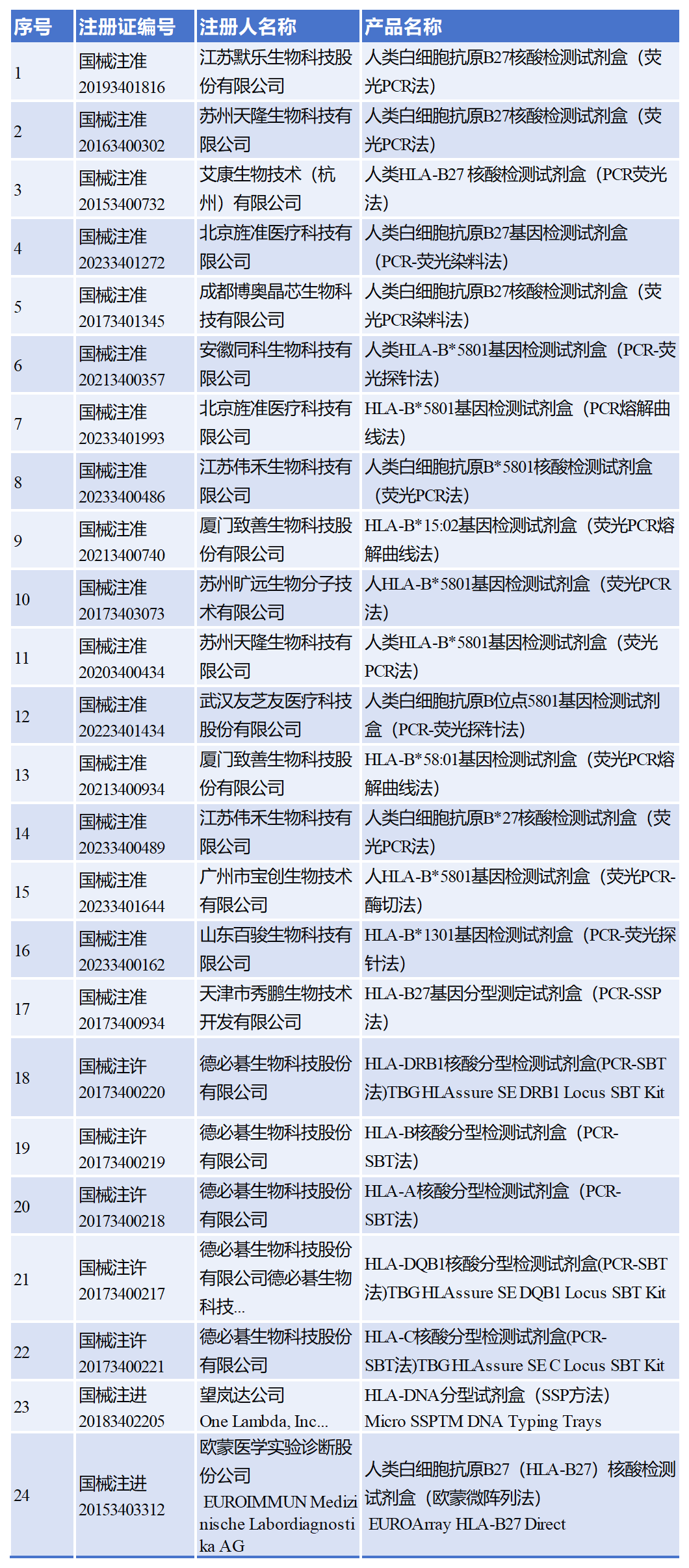 截至目前,已有24款HLA核酸檢測(cè)相關(guān)試劑盒獲批,具體如下: