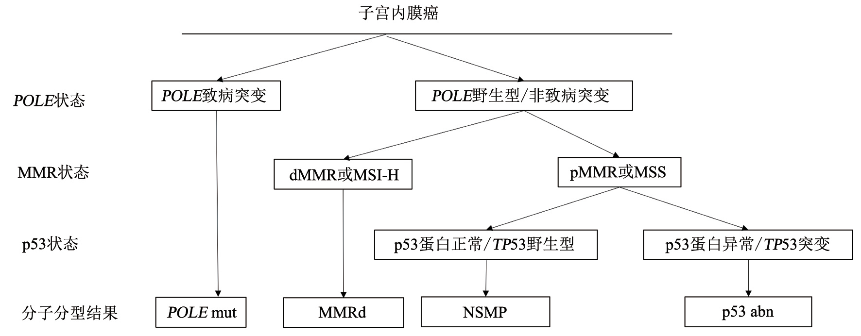 2013年美國癌癥基因組圖譜(TCGA),依據子宮內膜癌全基因組、轉錄組、蛋白組等多組學檢測結果,將其分為POLE突變型、微衛(wèi)星不穩(wěn)定突變型、低拷貝數型和高拷貝數型等4種類型。2023年國際婦產科聯(lián)盟(International Federation of Gynecology and Obstetrics,FIGO)分期建議,所有的子宮內膜癌EC患者均應完善分子分型檢測。